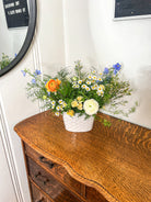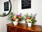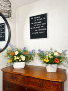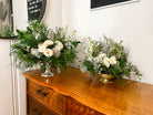 Low tabletop arrangement featuring 7 - 12 blooms plus textural accents and lush greenery. Perfect for a round table that will be accented with candles or loose greenery. Also great for bar or gift table accents.
